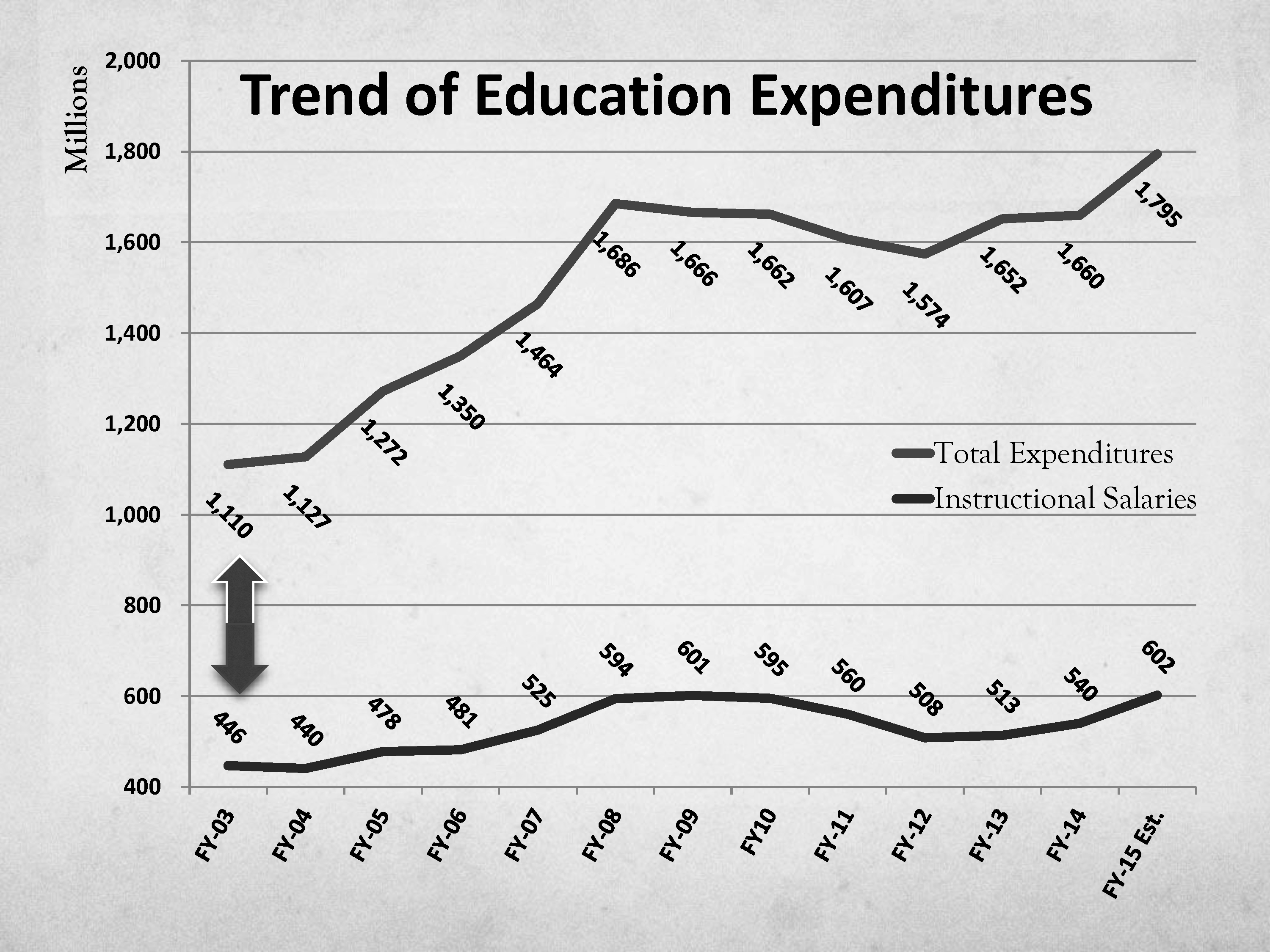 To substantiate my belief that there is room in the school budget to prioritize items without sacrificing our investment in the classroom, I want to point out a couple of facts about the school budget. Between FY2003 and FY2015, total school system expenditures have risen by 685 million. During the same time period, instructional salaries have only risen by 156 million1.